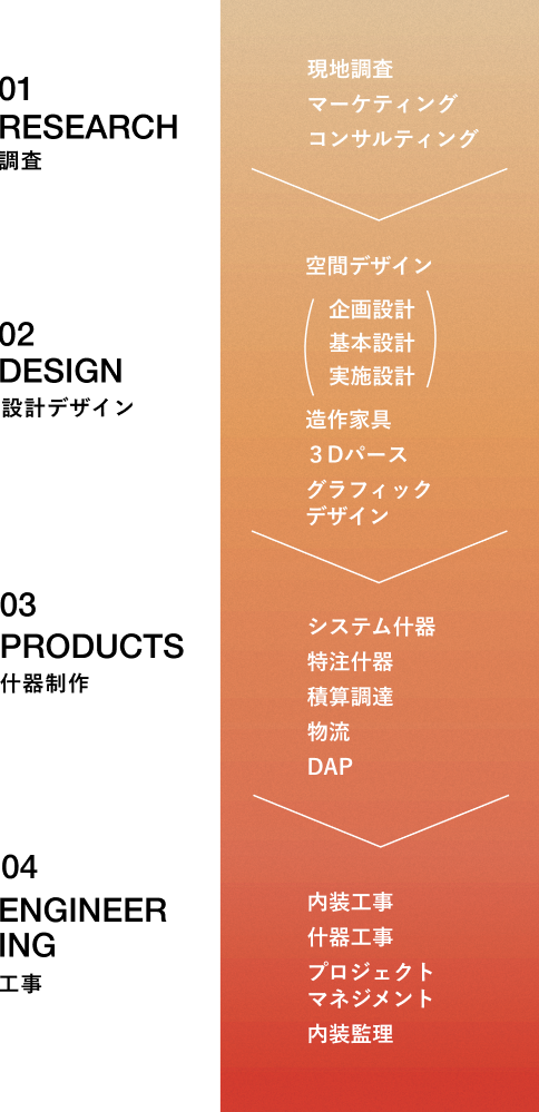 店舗空間の用途・デザインに合わせたオリジナル什器とシステム什器を国内外のパートナーと連携しながら企画・製作・搬入しています。モジュール化による汎用性と、デザイン性・耐久性を両立させ、グローバル調達によってコストと品質を最適化。単なる什器製作にとどまらず、空間全体の価値を高めるシステムとして提案します。